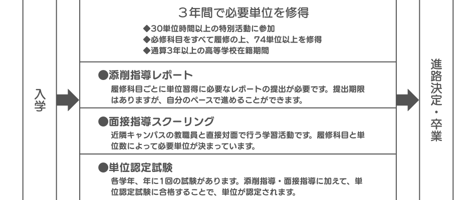 自宅学習に加えて、周辺キャンパスへの集中スクーリングで高校卒業資格を目指すコースです。